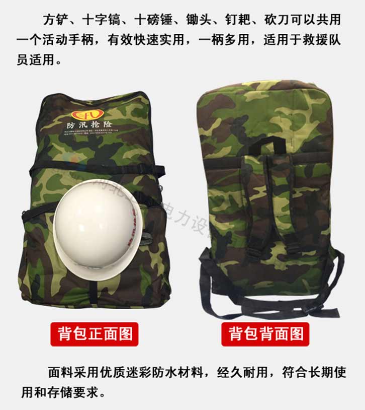 防汛組合工具包19件套:鎬、鈀、鋤頭、十磅錘、砍刀、方鏟、電筒、水鞋、防汛戰(zhàn)斗服、防寒雨衣、救生繩、雙背帶、救生衣、毛巾、水壺、頭盔、消防斧頭、信號燈、工具包。該組合工具包輕便、工具配備齊全適用于救援隊(duì)員使用。