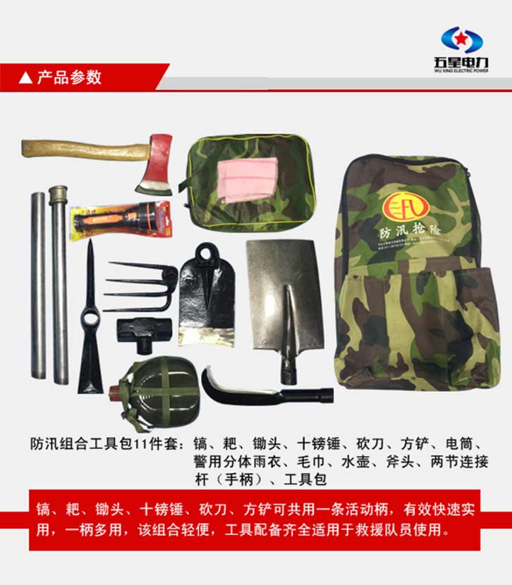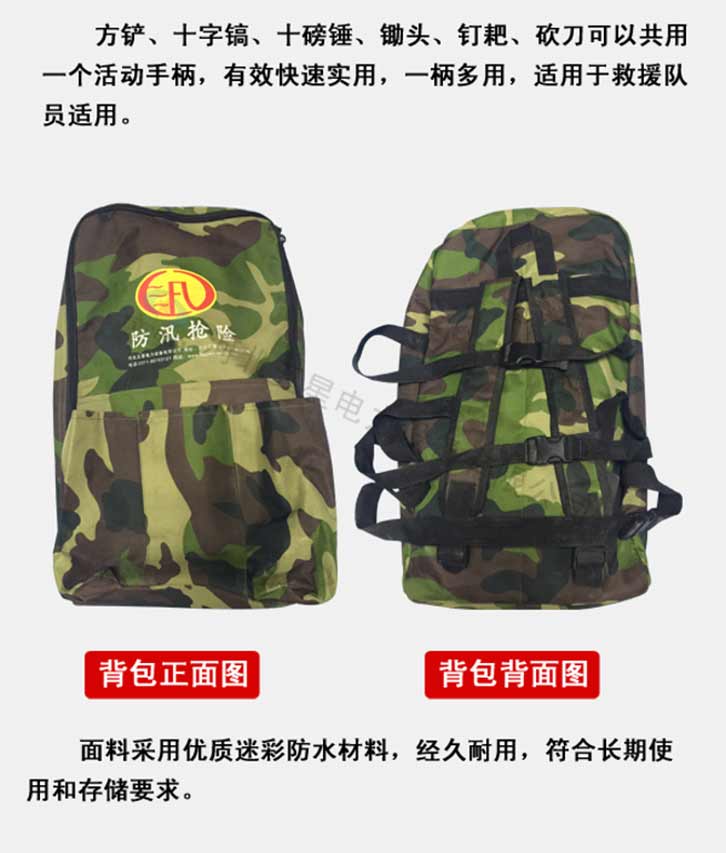 防汛組合工具包十一件套:鎬、鈀、鋤頭、十磅錘、砍刀、方鏟、電筒、警用分體雨衣、毛巾、水壺、頭盔。共用一條活動柄。該組和輕便,工具配備齊全適用于救援隊員使用。