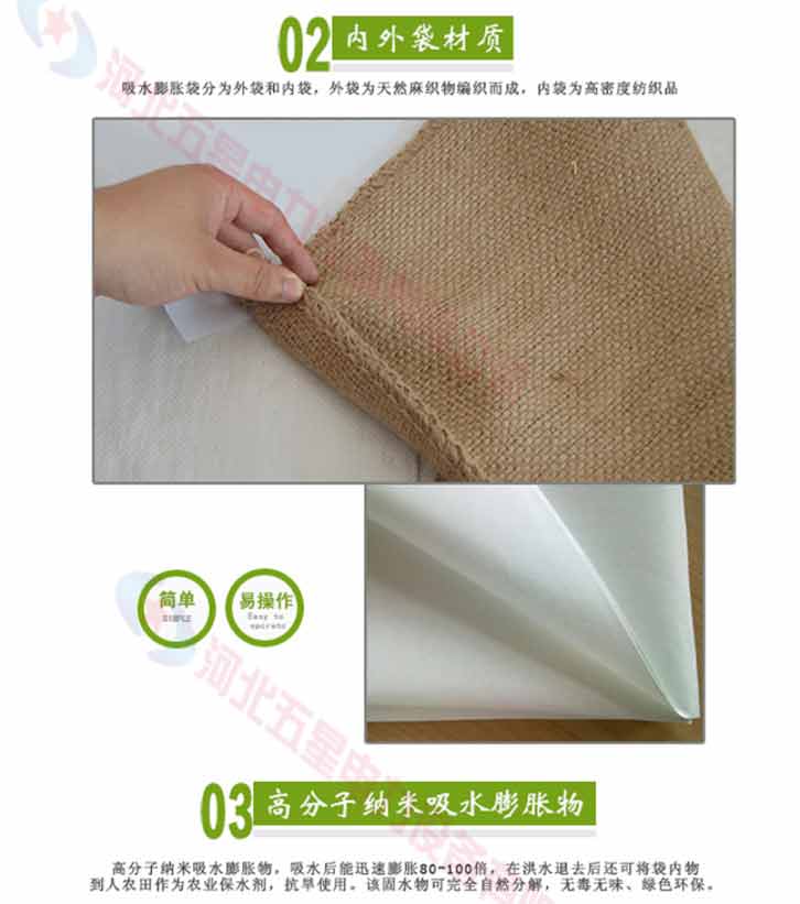 吸水膨脹袋內裝的是新型的高分子納米吸水物質,這種物質無毒、無味、無污染,吸水膨脹前為極小的顆粒物質,吸水后為黑豆大小的含水物質,干凈且無公害,待高分子吸水物質使用后可用于農業(yè)保水抗旱,所以在洪水過后可就地將袋內的物質傾倒入農田中,在泥土中可完全分解,是綠色環(huán)保、一舉兩得的首選產品。外袋為純麻布和棉布織成,遇水后麻繩可更加結實耐磨。