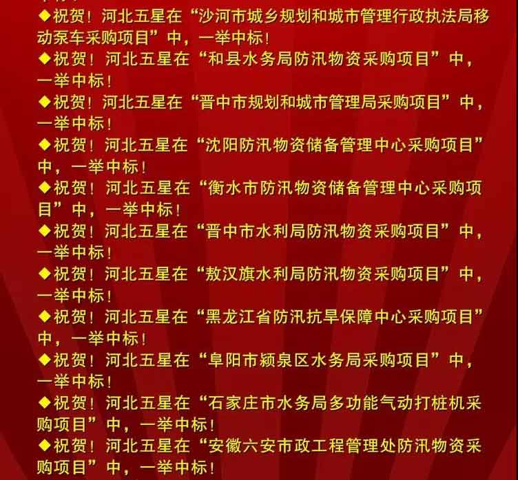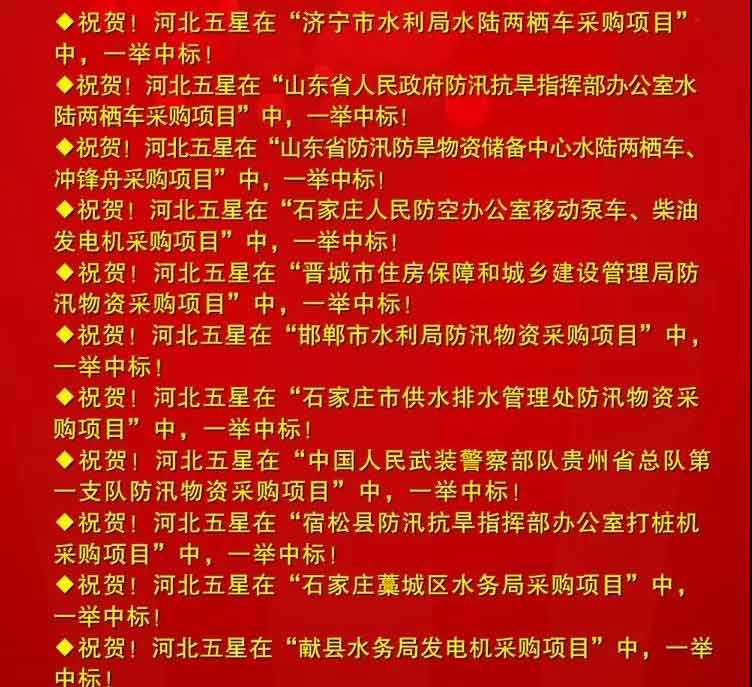 河北五星電力設(shè)備有限公司是我國(guó)防汛抗旱、搶險(xiǎn)救災(zāi)、應(yīng)急減災(zāi)救援和電力設(shè)備及安全工器具、市政設(shè)施、地下管網(wǎng)行業(yè)中,集科研、開(kāi)發(fā)、生產(chǎn)、銷售及服務(wù)于一體的現(xiàn)代化技術(shù)裝備高新技術(shù)企業(yè)。我公司多次中標(biāo)項(xiàng)目,榮譽(yù)成就屬于過(guò)去,河北五星永駐輝煌。